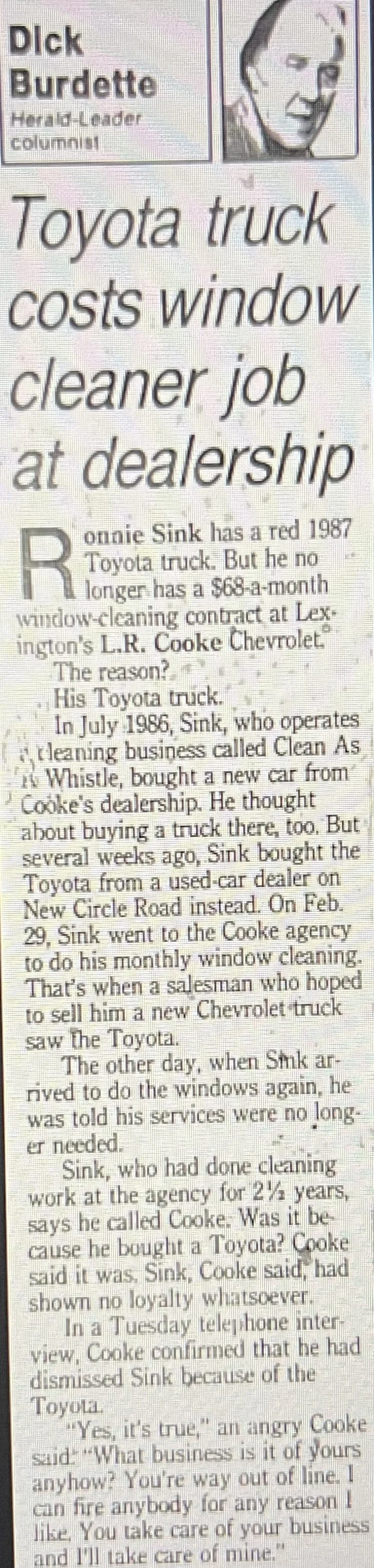 Then in August 1989 that all changed. Toyota reached out to us about cleaning the windows at their new facility in Georgetown, KY (after having read the article below), beginning a life-changing adventure that is still going strong today!